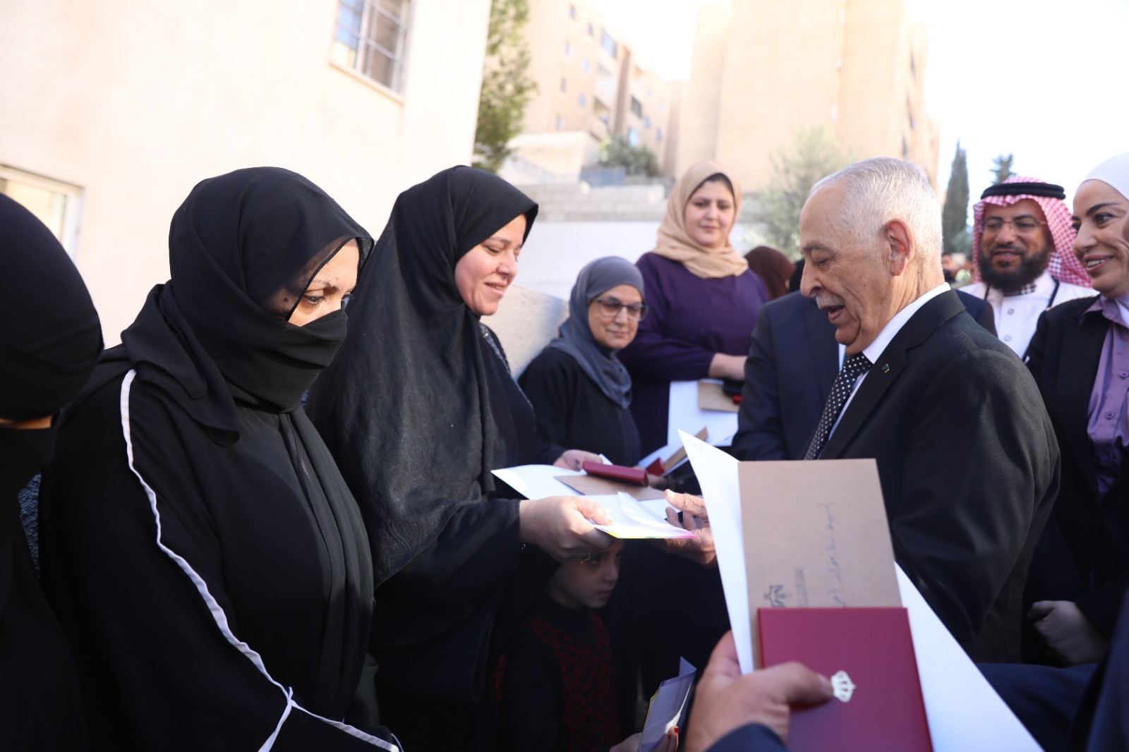 وسلّم رئيس الديوان الملكي الهاشمي يوسف حسن العيسوي، رئيس لجنة متابعة تنفيذ مبادرات جلالة الملك، مفاتيح الشقق السكنية وشهادات الانتفاع للأسر المستفيدة، بحضور وزير الأشغال العامة والإسكان المهندس ماهر أبو السمن، ووزيرة التنمية الاجتماعية وفاء بني مصطفى، ومحافظ العاصمة ياسر العدوان، ومدير عام مؤسسة الإسكان والتطوير الحضري جمانة العطيات، ومدير مكتب الأردن في هيئة الأعمال الخيرية العالمية – الإمارات العربية المتحدة رائد صبري أبو علفة.