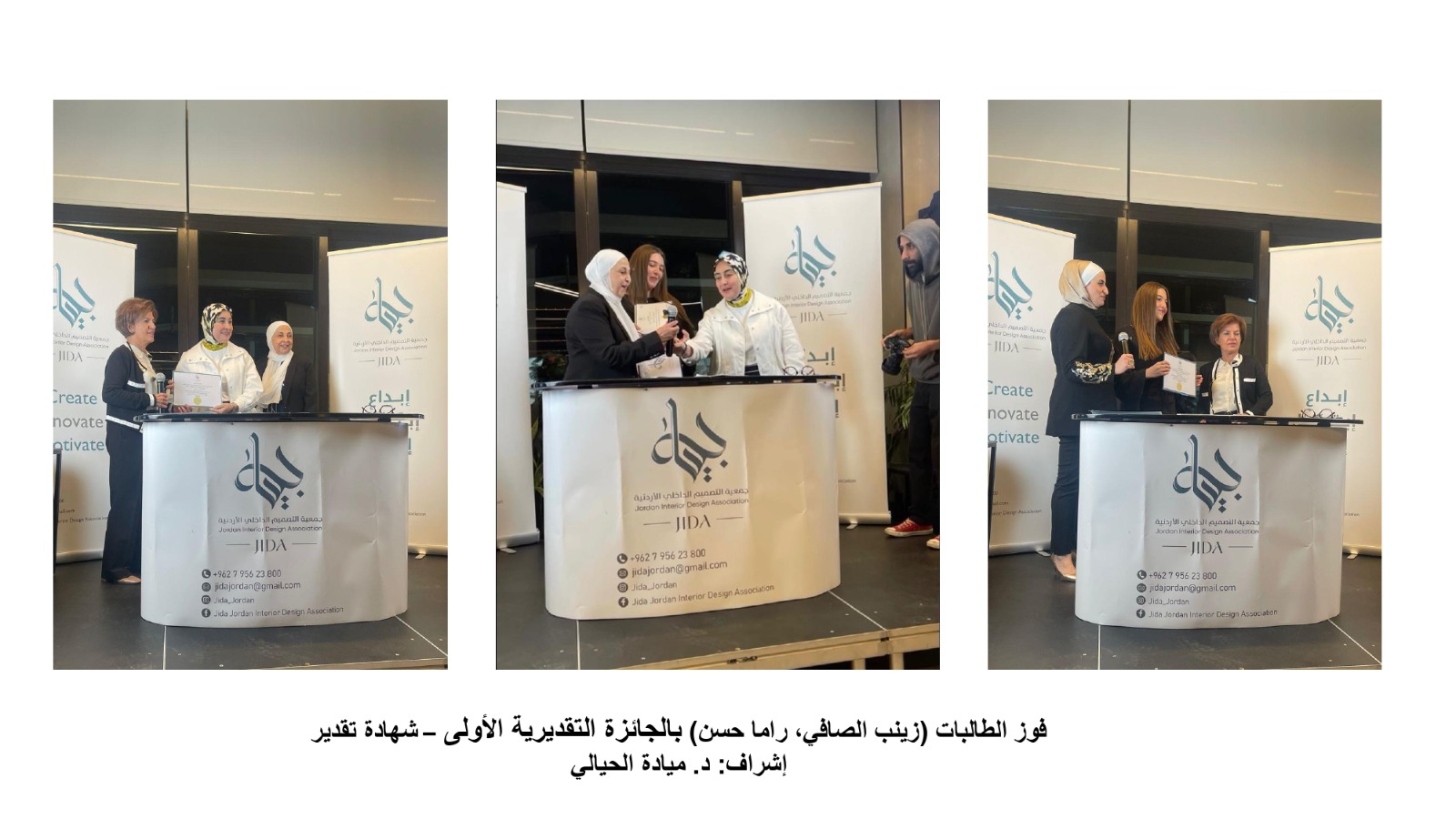 وفازت بالمركز الثاني مناصفة، وجائزة نقدية بقيمة ثمانمائة دينار، الطالبتان زينة الحميمات وجود الحويان، بإشراف الدكتورة ميادة الحيالي. كما حصدت الجائزة التقديرية الأولى، من أصل أربع جوائز تقديرية، الطالبتان زينب الصافي وراما حسن، بإشراف الدكتورة ميادة الحيالي أيضا.