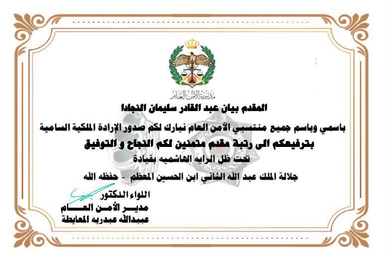 وطنا اليوم- يتقدم عطيه النجادا بأسمى آيات التهنئة والتبريك من ابنة العم العزيزة المقدم بيان عبد القادر النجادا (ام وسام) بمناسبة صدور الاراده الملكية السامية بترفيعها الى رتبة مقدم في جهاز الامن العام