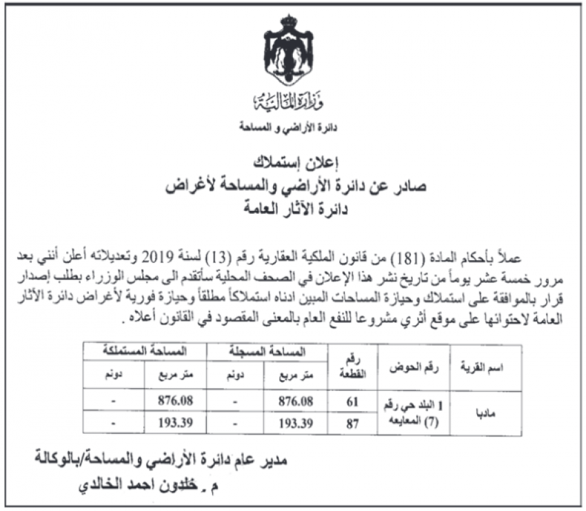 وطنا اليوم:أصدر مدير عام دائرة الاراضي والمساحة بالوكالة المهندس خلدون الخالدي، إعلانًا رسميًا يؤكد عزمه تقديم طلب استصدار قرار من مجلس الوزراء للموافقة على استملاك وحيازة قطعتي أرض في منطقة “حي المعايعة” في مدينة مادبا.