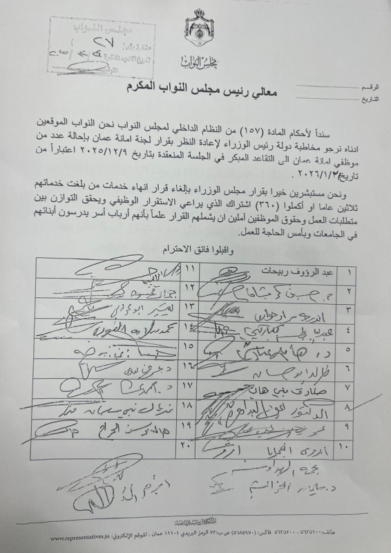 ووجه 21 نائباً مذكرة إلى رئيس مجلس النواب تبناها النائب عبدالرؤوف الربيحات، طالبوا فيها برفع المذكرة إلى رئيس الوزراء، مؤكدين أن قرار إنهاء خدمات الموظفين الذين أتموا 30 عاماً أو أكثر من الخدمة، لم يراعِ ظروفهم الأسرية، خاصة أن بعضهم يعيلون أبناء يدرسون في الجامعات، ويعانون أوضاعًا مالية صعبة
