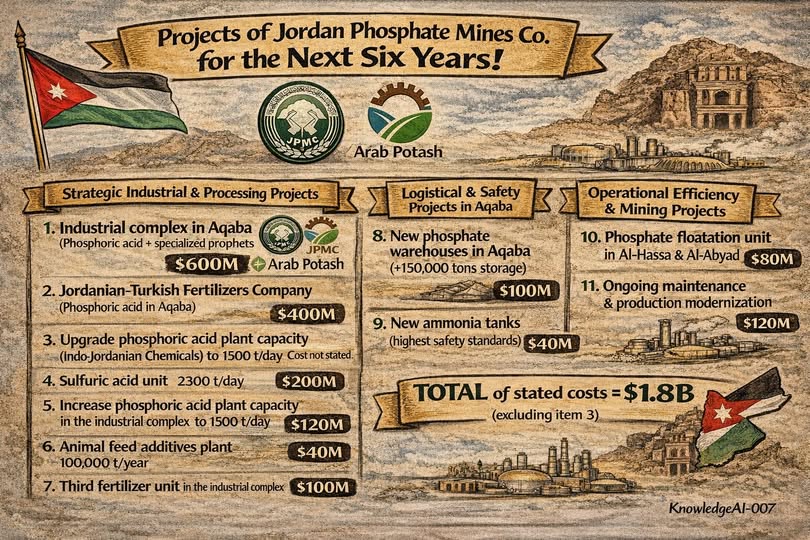 وفي مقدمة هذه المشاريع، يأتي إنشاء مجمّع صناعي متكامل في العقبة لإنتاج حامض الفوسفوريك والأسمدة الفوسفاتية المتخصصة بالشراكة مع شركة البوتاس العربية، بكلفة تقارب 600 مليون دولار، إلى جانب تأسيس الشركة الأردنية التركية للأسمدة لإنتاج حامض الفوسفوريك بكلفة تصل إلى 400 مليون دولار، ما يعزز الشراكات الإقليمية ويفتح أسواقاً جديدة للمنتج الأردني.