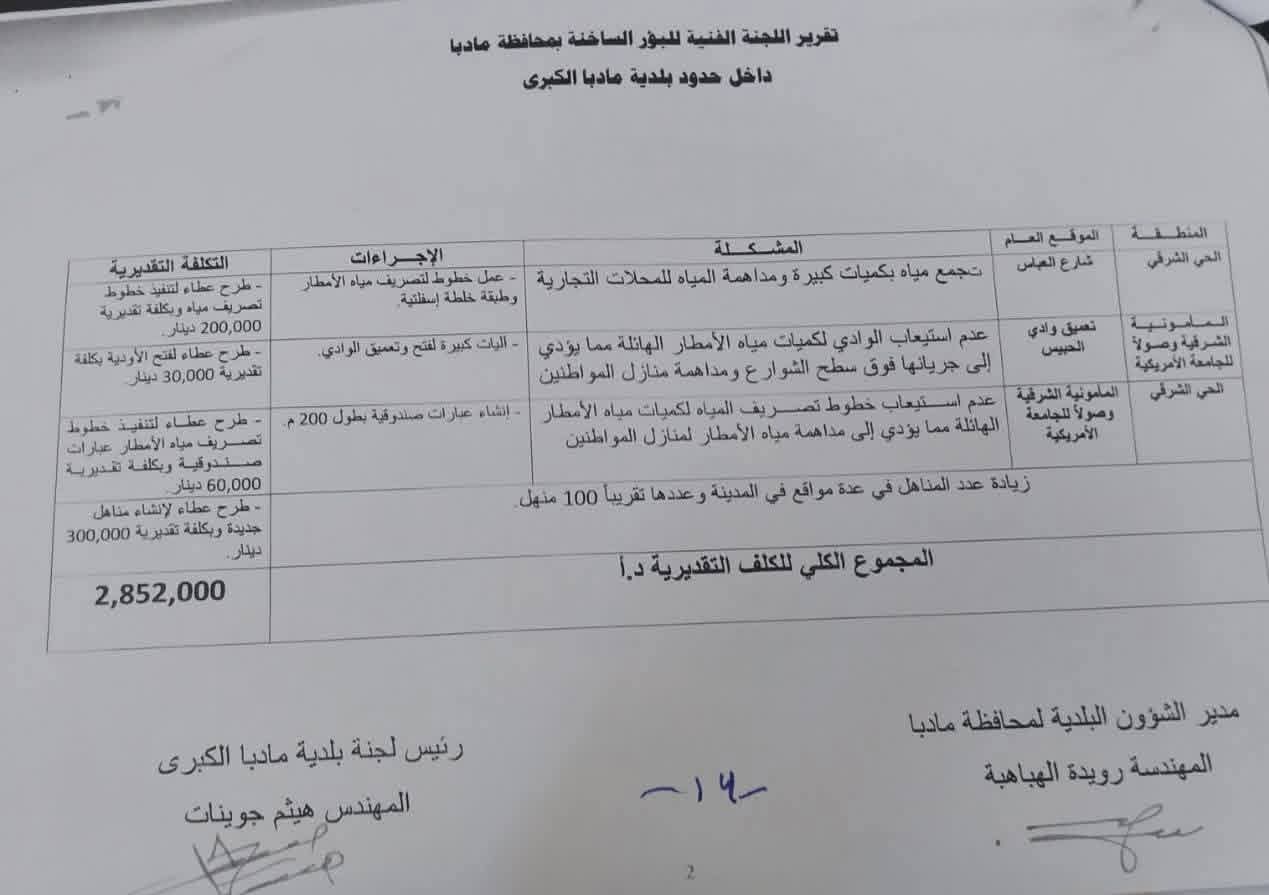 5. 13 بؤرة ساخنة في مادبا واستملاك لخمسة منازل ضمن مسار الاودية /// و تنفيذ عطاءات لتحسين وتجويد شبكة تصريف مياه الامطار بمبلغ(2,852,000) الف دينار (مرفق التقرير) .