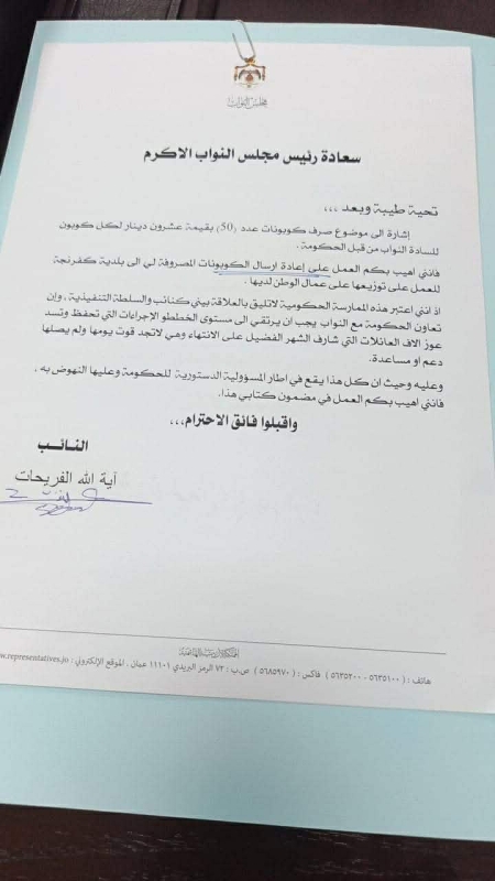 وطنا اليوم:وجه النائب آية الله الفريحات كتابا إلى رئيس مجلس النواب مازن القاضي طلب فيه إعادة إرسال كوبونات المساعدات المصروفة للنواب إلى بلدية كفرنجة، للعمل على توزيعها على عمال الوطن.