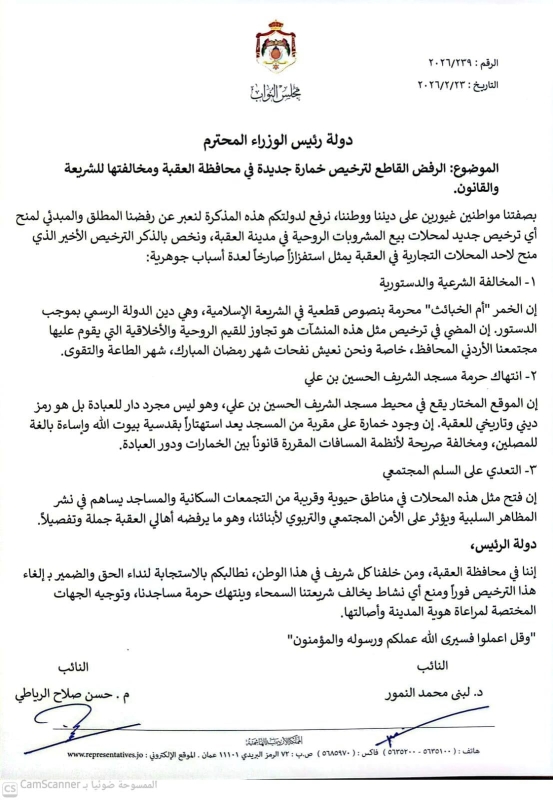 وأكد النائبان أن الخمر محرّمة شرعاً، وأن الإسلام دين الدولة بنص الدستور، معتبرين أن منح الترخيص يشكّل انتهاكاً لحرمة مسجد الشريف الحسين بن علي ومحيطه، ويمس بالسلم المجتمعي وقيم أهالي العقبة وهويتها المحافظة.