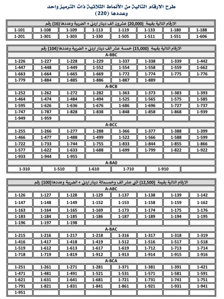 وطنا اليوم:أعلنت إدارة ترخيص السواقين والمركبات عن طرح مجموعة جديدة من الأرقام الثلاثية ضمن ترميز (1) للبيع المباشر، وذلك نظرا لنفاذ الأرقام التي تم طرحها في الدفعة الأخيرة. وسيتم توفير هذه الأرقام من خلال البوابة الإلكترونية للإدارة وفقا للمواعيد والإجراءات التالية: