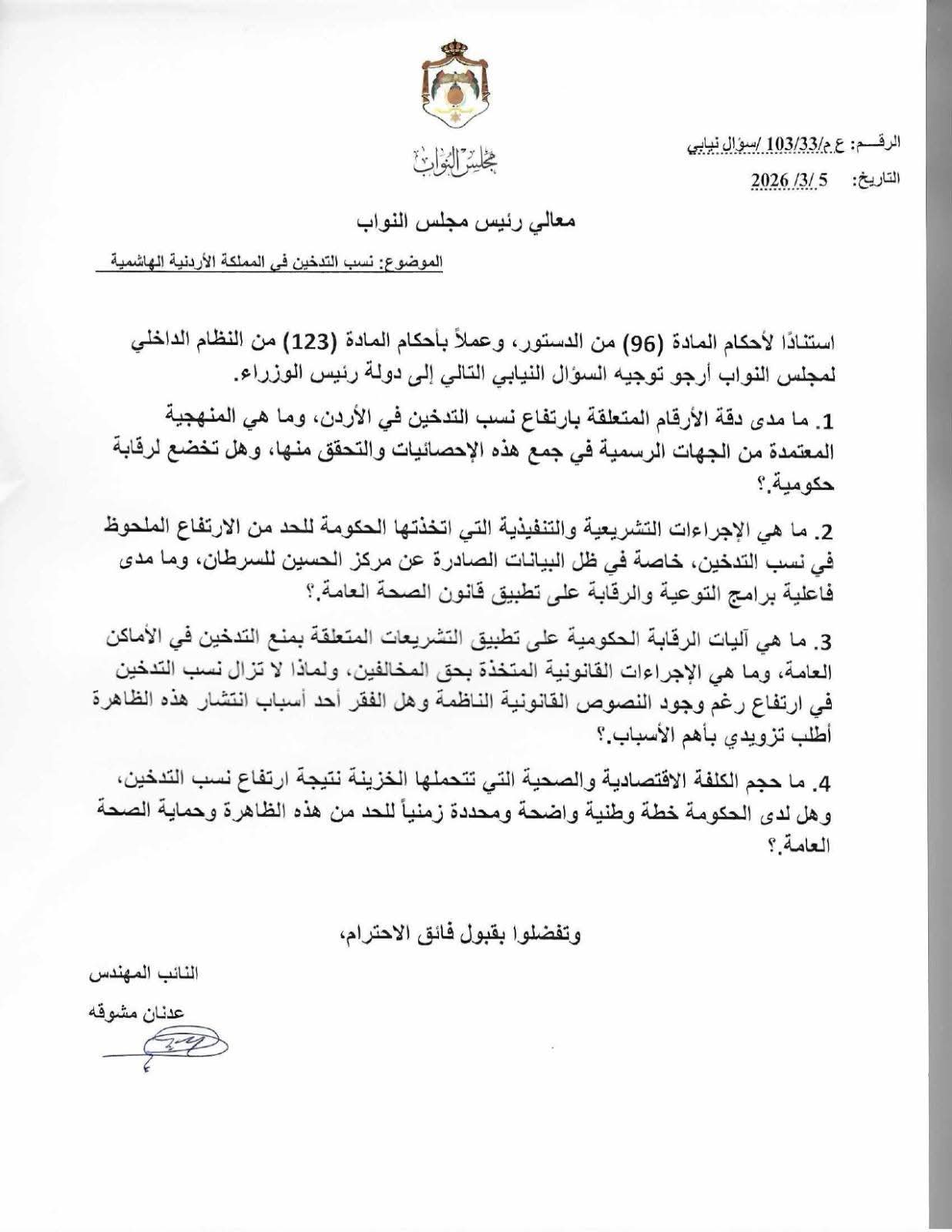 4. ما حجم الكلفة الاقتصادية والصحية التي تتحملها الخزينة نتيجة ارتفاع نسب التدخين، وهل لدى الحكومة خطة وطنية واضحة ومحددة زمنياً للحد من هذه الظاهرة وحماية الصحة العامة.؟
