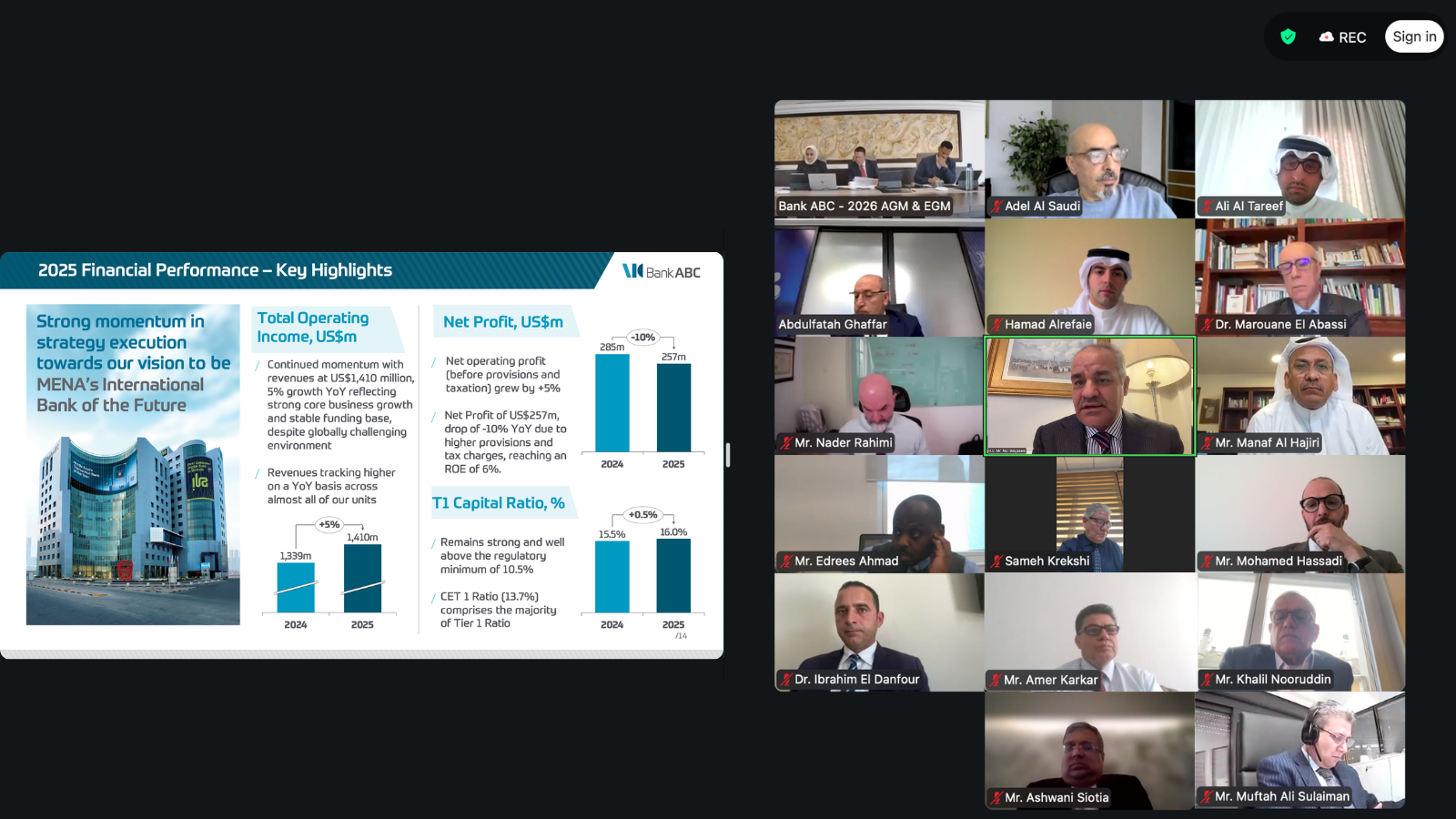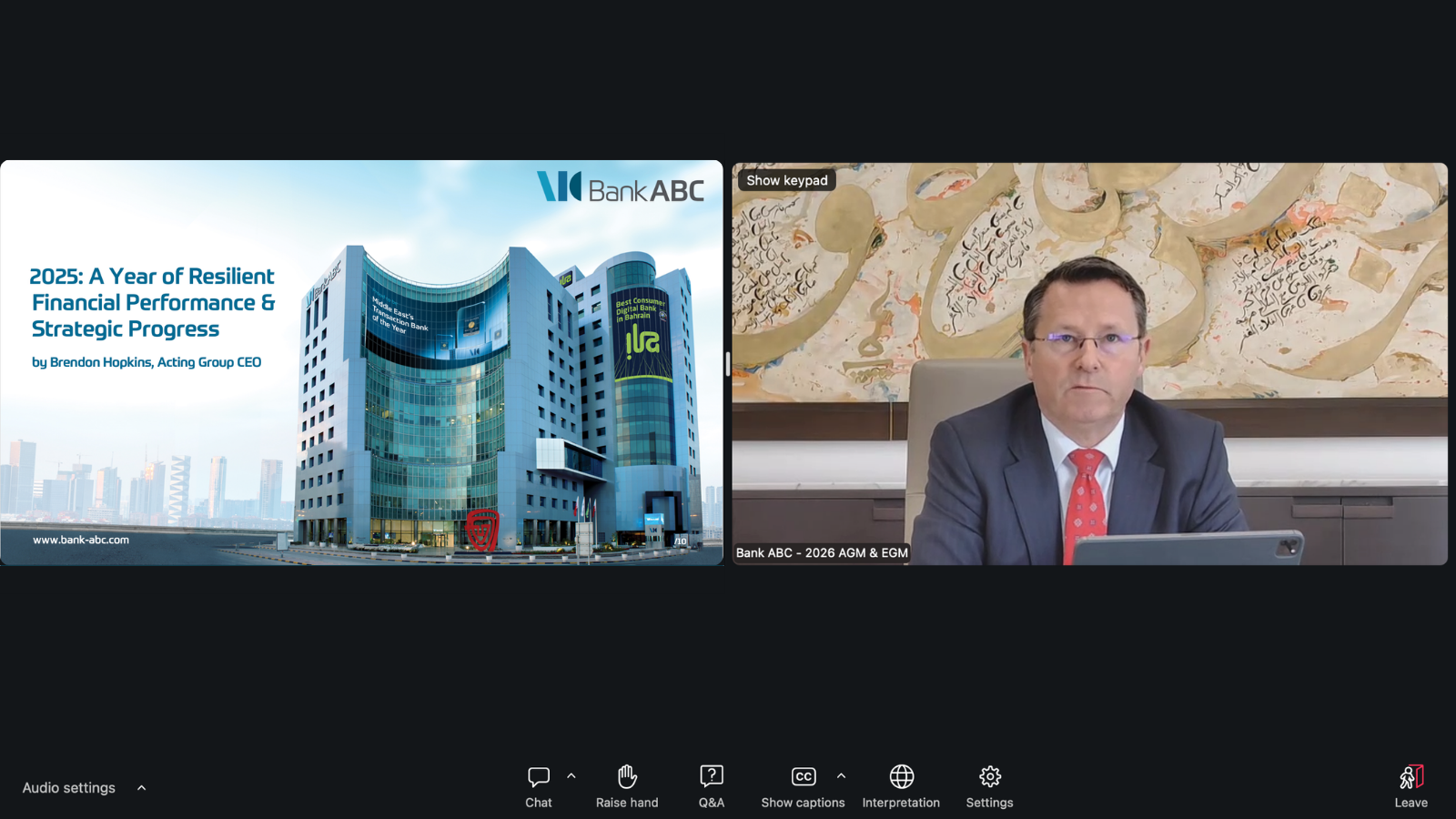 وطنا اليوم:عقد بنك ABC (المؤسسة العربية المصرفية ش.م.ب.) اجتماع الجمعية العامة العادية وغير العادية إلكترونيًا بتاريخ 26 مارس 2026، وقد ترأس كلا الاجتماعين رئيس مجلس إدارة المجموعة سعادة السيد / ناجي بلقاسم.