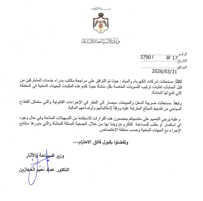 كما تضمّن القرار تكليف البنك المركزي الأردني بمخاطبة البنوك التجارية لتقديم التسهيلات اللازمة، والمساعدة في جدولة وتقسيط الالتزامات المالية المترتبة على هذه المنشآت، وذلك حتى تاريخ 31/12/2026.