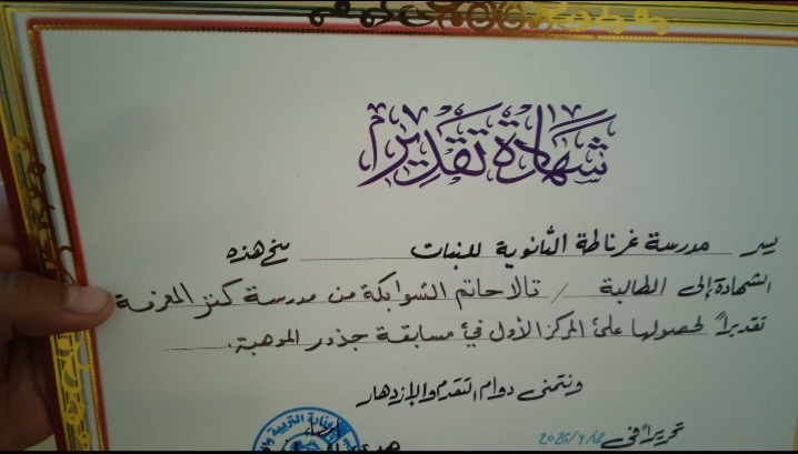 وطنا اليوم – حصلت مدرسة كنز المعرفة بمادبا على المركز الأول على مستوى مديرية التربية والتعليم في مسابقة “جذور الإبداع والموهبة” التي نظمتها مدرسة غرناطة الثانوية للبنات حيث مثلت المدرسة في المسابقة الطالبتان من الصف العاشر “تالا حاتم الشوابكة” و ” ولاء محمد الطرابلسي” اللتان قدّمن أداءً مميزاً يعكس روح الإبداع والتميّز.