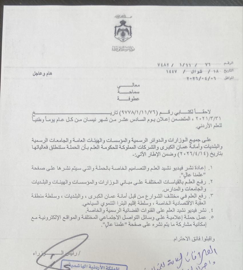 كما طلب برفع العلم في مختلف الشوارع من قبل امانة عمان والبلديات وسلطة منطقة العقبة واقليم البترا ونشر فيديو العلم على القنوات الفضائية الرسمية والخاصة وعمل حملة اعلامية على وسائل التواصل الاجتماعي المختلفة والمواقع الالكترونية مع امكانية مشاركة ما يتم نشره على صفحة علمنا عال.