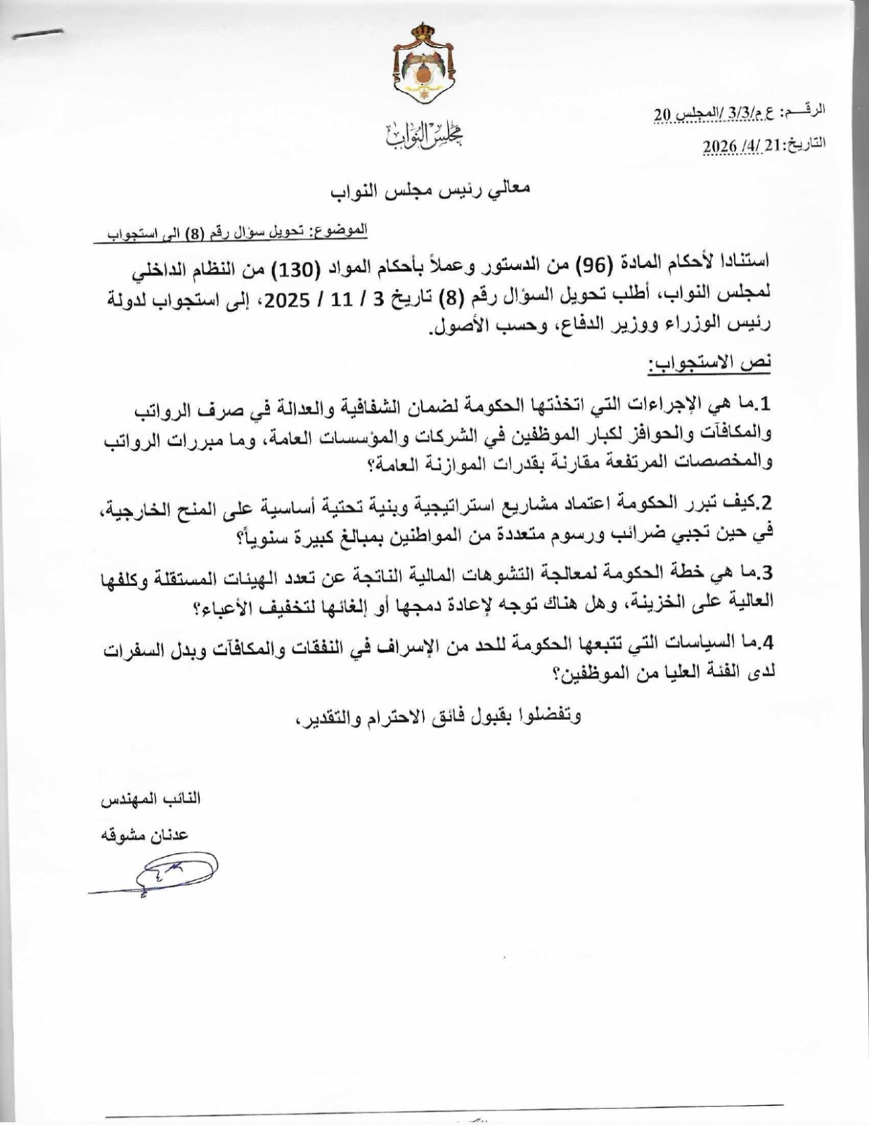 استنادا لأحكام المادة (96) من الدستور وعملاً بأحكام المواد (130) من النظام الداخلي لمجلس النواب، أطلب تحويل السؤال رقم (8) تاريخ 3 / 11 / 2025، إلى استجواب لدولة رئيس الوزراء ووزير الدفاع، وحسب الأصول.