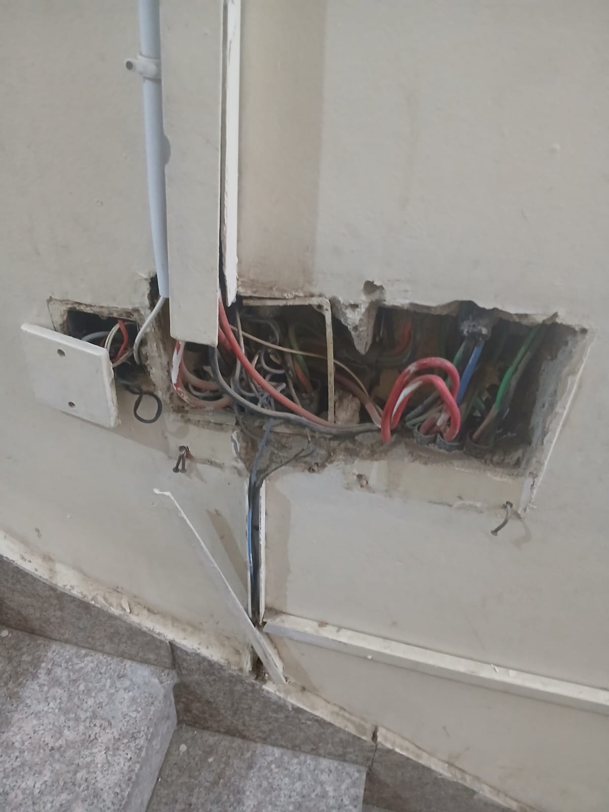 درج مهشّم، مصاعد خطيرة، بلاط مفقود، درابزين مفقود، دهانات متّسخة، بقع سوداء على الجدران، دورات مياه غير صالحة للاستخدام الآدمي، واجهات مهترئة تكسوها بقايا يافطات وأسلاك متناثرة، وروائح كريهة تصفع الداخل قبل أن تطأ قدمه أول درج، وأسلاك كهرباء مكشفة قاتلة.