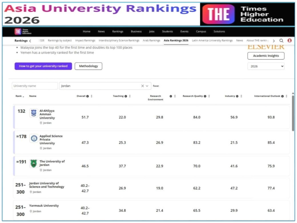 وقال: “تصدُّر جامعة عمان الأهلية للجامعات الأردنية في تصنيف التايمز لجامعات آسيا 2026، وتقدّمها أربعاً وخمسين مرتبة في عام واحد، هو ثمرة عملٍ مؤسسي متكامل يجمع أعضاء الهيئتين التدريسية والإدارية والطلبة في منظومة واحدة. ونحن فخورون بهذا الإنجاز، وملتزمون بمواصلة الارتقاء بمخرجات التعليم والبحث العلمي بما يخدم الجامعة والوطن والمنطقة”.