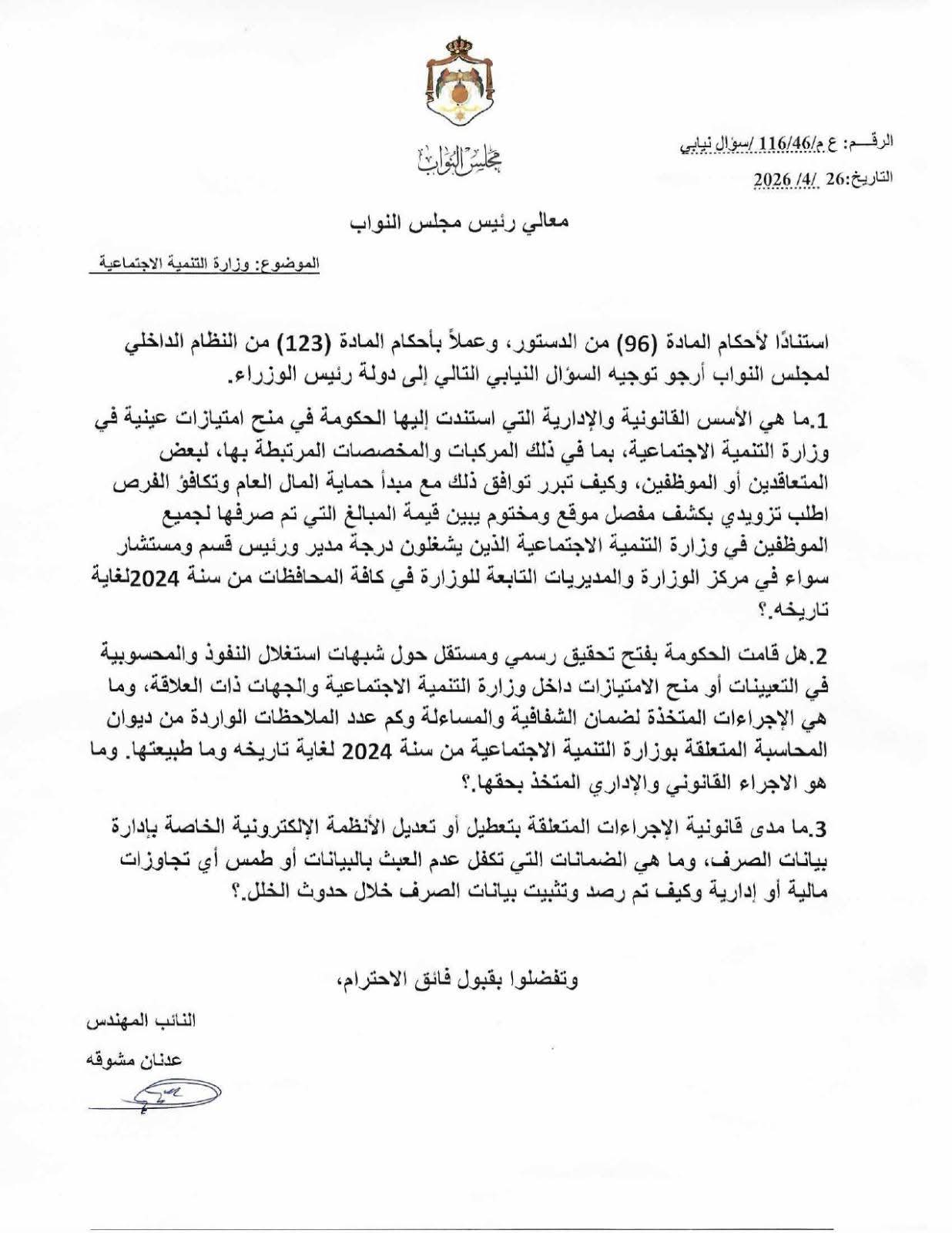 وطنا اليوم:مشوقة يسأل الحكومة عن امتيازات وزارة التنمية الاجتماعية هل طبقت القانون ام تجاوزته.